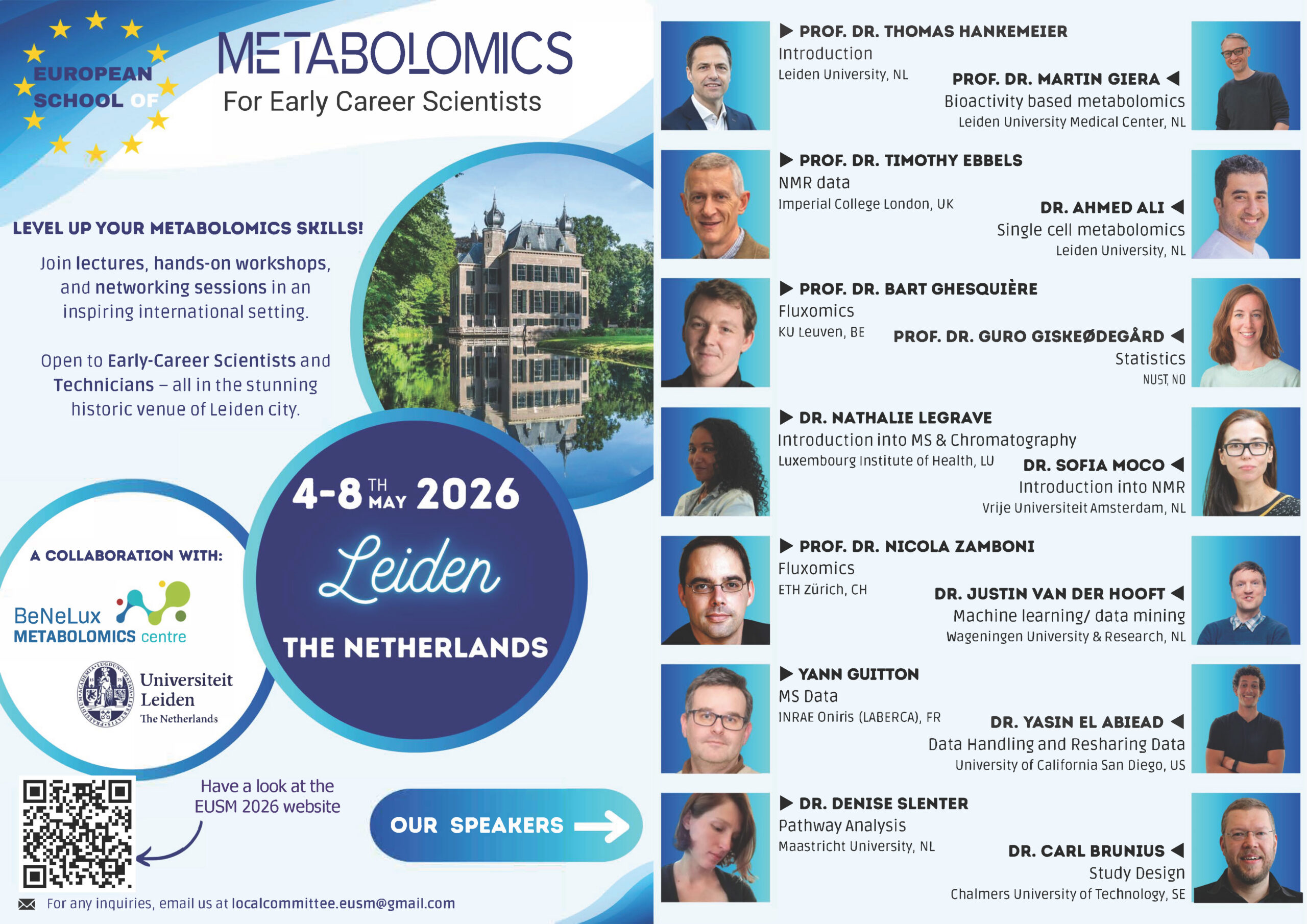 EUSM 2026 is organised in collaboration with the Benelux Metabolomics Centre and supported by Leiden University and the laboratory of Prof. Dr. Thomas Hankemeier, a distinguished expert in metabolomics research. The engagement with the wider scientific community is important for our school.